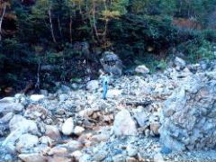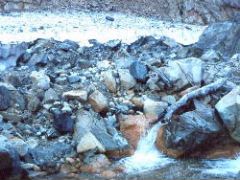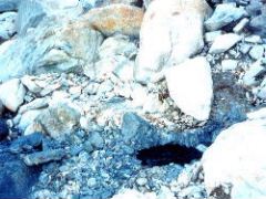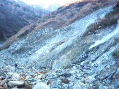 | が、 よくよく探してみると少し沢よりにチョロチョロと黒い湯がながれているではありませんか。 湯温は35−6℃? 湯量はごくわずかです。 さらに岩盤が固く掘れません。 直径30cm深さ10cm程度の湯溜りしか出来ず くやしいので足だけ浸けて帰りました。 ドカシーに溜めたとしてもこの気温(おそらく氷点下)では・・・ |