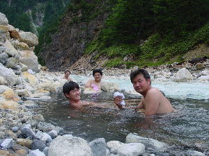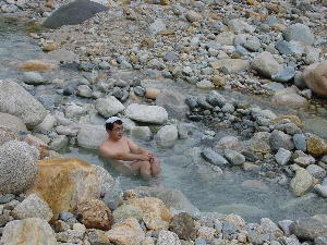 噴湯丘から沸いてきた湯が川と混ざる辺りで入浴です。3段の湯船ですが下流でも底から湯が沸いているので温度が下がりません。いい気分です。 |