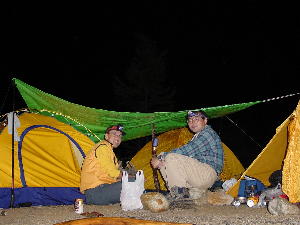 2000年初めての秘湯野宿宴会です。 この日は天気も悪くあまり人が集まりませんでした。 でも何とか5人集まりました。 よくこの天気で2時間以上歩いてくるよなあ。 夕方から断続的に雨が降り早々に宴会は切り上げとなってしまいました。 |
