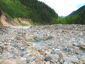 翌朝は晴嵐荘横の河原にある露天風呂へ向かいます。川の水量がすごく少ないです。 |