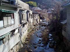 焼谷川を挟んで建物が建てられています。 渡り廊下からの眺めです。 建物はかなり古いもので雰囲気がすばらしいです。 |