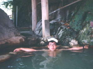 川沿いにある共同湯。100円入れてつり橋を渡る。