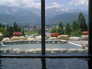 白馬ハイランドホテルにある温泉。 露天からの白馬の山並みの眺めは最高。