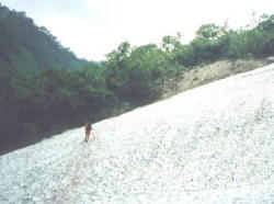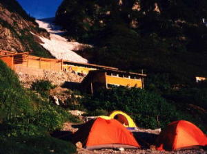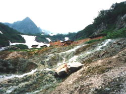 最後の雪渓から上部に山荘が見えます。 山荘の手前には温泉が流れ出て温度が高いため雪が融けて地面が露出しています。 |