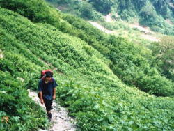 猿倉の駐車場から歩き初めます。 最初1時間は急登で健脚の人から一気に離されます。 私ら遅れてはいてもキャンプ道具背負って コースタイムよりは早いつもりなんだけどね。 絶対先に行った連中が変態なんだ! |