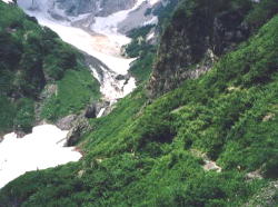 山肌に沿って造られた細い登山道を登っていきます。 途中3個所くらい雪渓を渡ります。 |