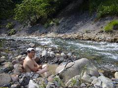 で、結局ヌプントムラウシへ戻り川原を掘って入浴。 底が固くあまり深く掘れませんでしたがここの醍醐味はやっぱりこれでしょう。 他の人たちはゲロ混みの木の露天風呂の順番を待っていました。 |