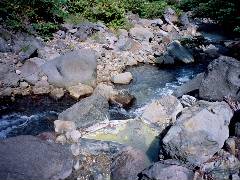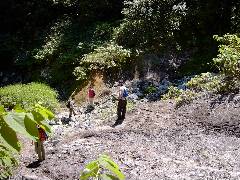 実は目指した場所はここではないのですが完全にタイムアップ。 ここの場所で入浴することにしました。 私は完全にシャリバテ。昼飯食ったら復活しました。 良く見ると湯船を組んだ跡みたいです。 2〜3年くらい前のもの? 大きな岩がいくつか落ち込んでいました。 この状態で37.5℃、pH6.02です。 |