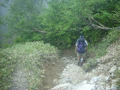 本日の宿泊地までは今度はひたすら下りて行くだけです。 結構急で足場が悪いです。 これ、帰りも通るんですよ。 ということは帰りは延々登り・・・ |