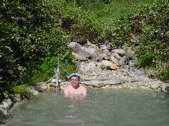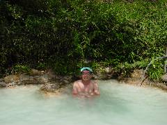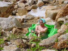 混浴の大きな露天風呂へ飛び込み2日間の疲れを癒します。 と言いたい所ですが腕、首筋が日焼けでヒリヒリとしてのんびり浸かってられません。 |