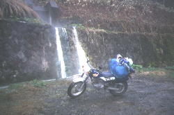 崖の上で一旦湯が溜まり、そこから5mくらい下の川へと滝になって流れ落ちていきます。ここの窪みにドカシーをはめ込むことにしました。 |