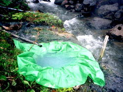 落ちていたパイプを使いドカシーへ湯を溜めます。 湯量が豊富であっと言う間に湯が溜まります。 ここで45℃近くあるでしょうか? |