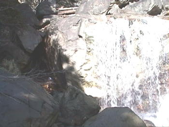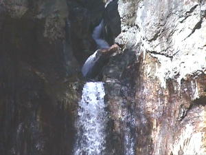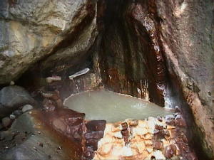 突然目の前に滝が現れます。 その横に何やら洞窟があります。 良く見ると湯が溜まっていてこれが適温なんですね。 |