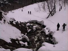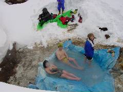 | 左の写真は上部の湯です。 メインの湯より温度は若干高いです。湧出個所が低いのでドカシ-にうまく溜められませんがまあ十分です。ここからメインの湯まで約20m。着替えを抱えて雪の上を素っ裸で走って行きました。 まさか同じ事をする人が他にもいようとは・・・ | |