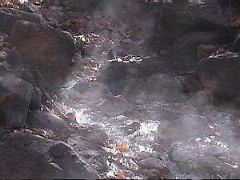 手白沢へ向かう遊歩道(登山道?)脇から湯がゴボゴボと沸いています。その湯が川へと流れ込んでるあたりで入浴しました。 ちなみに温度調節はかなり困難で熱さに叫びながらの入浴となりました。 |
