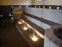 出来てすぐなのでやっぱり中はきれいです。 かけ湯・その奥が長いベンチの下に足湯があります。 |