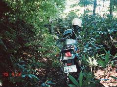 最初は地図上では点線の道(登山道?)です。 歩き始めて意外と道らしくなってることに気付き、バイクで行ける所まで行ってみることにしました。 最初は完全な薮こぎ(バイクで)です。 |