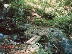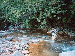 で、肝心の温泉ですが、川へ下りる場所を探すのに難儀し、遡上を開始するもあまりの水の冷たさ・多さに閉口。 少し遡上しただけで引き返すはめとなりました。 |