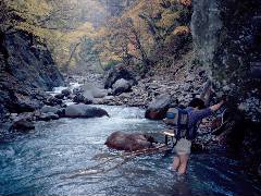 新川と赤川の中間あたりで急斜面を無理矢理下り万座川で降り、靴・ズボンを濡らしながらバシャバシャと遡行します。 水量はかなりあります。 こんな瀞場もあります。 水量が多いときは腰以上まで浸かりそうです。 |