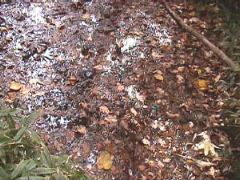 最頂部へ登ってみると落ち葉・枯葉・虫の死骸などが詰まってぬかるんでいる所がありました。 一個所ズボズボと踏み抜きそうなところがあり、この落ち葉等を取り除いてみると・・・ |