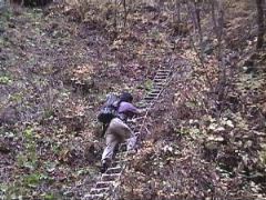 ところで苦労して万座川へ降りたわけですが 近くの斜面にこんな はしごがありました。 当然帰りはこれを利用しました。 登りきった所は降り始めた所でした。 |