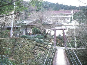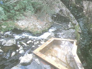 内湯・洞窟(トンネル?)の温泉を通って川の上にせり出すように造られた露天風呂に行ける。