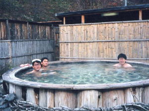 木造の大きな露天風呂。 混浴。