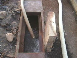 ちょっと狭いですが 側溝にドカシーをはめ込み 湯を溜めます。 |
