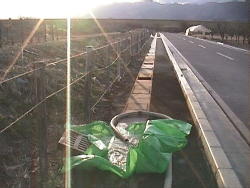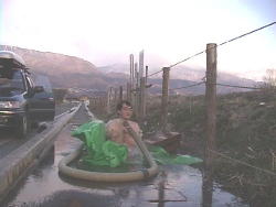 お尻は完全にはまりきらない状態ですがなんとかおへそ当たりまで湯に浸かれました。 肩から湯を浴び打たせ湯も楽しめます。 湯温は42−43℃程度でしょうか? すごくいい温度です。 このあとすぐ横の道を地元の人が通りかかりました。 (ひきつった)笑顔で応対です。 |