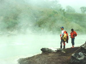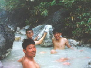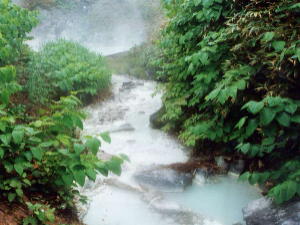 50mくらい下ったところにちょうどいい湯溜まりを発見。 温度は約40℃です。 思わず飛び込みましたが膝くらいまで泥に埋まりました。 体全体が泥だらけになり後で体を拭くのに大変でした。 また靴の金具がサビサビになっていました。 |