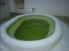 りっかりっか湯(那覇市) 入浴料1200円 一番奥の露天風浴槽のみ温泉。 やや黄がかった湯。 |