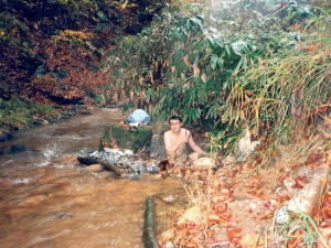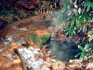 奥まった小さな沢の脇から結構熱い湯がぼこぼこと沸いています。 |