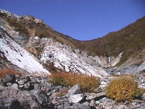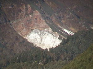 白骨温泉から湯川林道へ入ります。通行禁止なので歩いていきます。 すると遠くの山肌に地獄を形成している様子がわかります。 |