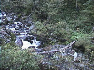 | 1時間足らずでゴウト沢へ出ます。 ここで丸太橋を渡り延々と歩きます。 最後の方は足場がかなりヤバイです。 沢から1時間程歩くと地獄へ到着です。 |