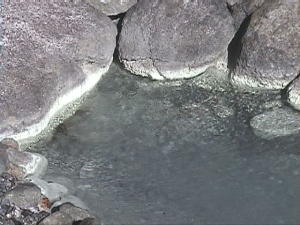 温泉は誰かが組んだ湯船の底から湧いています。 湯量はかなり豊富です。 湯温は40℃強。適温です。 濁ってるようですがこれは底の泥の為です。 湯量があるのですぐに透明になります。 かなり酸っぱい感じの味の湯です。 |
