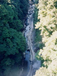小安峡皆瀬川にかかる湯河原橋から下を見ると湯煙がもうもうと出ているのが見えます。 |