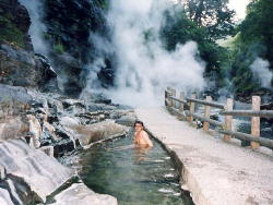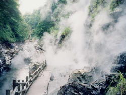 遊歩道まで降りるとあたり一帯が湯煙に包まれています。 すごい熱気です。 横の川も熱湯になっています。ということは温度が下がったところは川全体が湯船とも言えます。 |