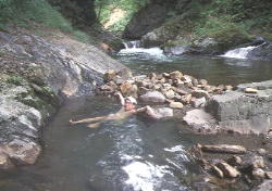 | 然別峡野営場からユウヤンベツ川の上流に沿っていくつのも野湯が存在します。 1996年の自然公園法での事件後湯船は取り除かれたが湯は当然のごとく流れ続けています。 |