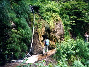 燕温泉から惣滝へ向かう遊歩道沿いにはいくつもの源泉を引湯するパイプがあります。