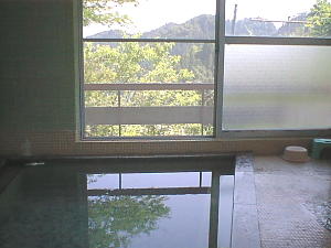 すごい山の中。 となり(続き)のやきもちやで食事も出来る。 湯船に浄化のため(?)の炭が入っている。