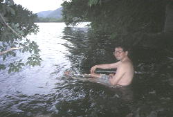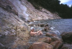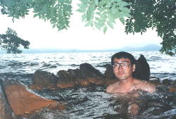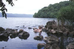 | 旧展望台の湯 かつての展望台だったのでしょうか。 現遊歩道から崖を下った所にベンチの跡があります。 そのすぐ下に岩で囲った湯船がありすばらしく適温です。 湯船は不完全で湖水が入り放題ですが湧出量が多いのか温度は全く変わりません。 快適な湯です。 |