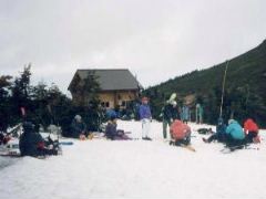 歩き始めてしばらく歩き一回の休憩を挟み 大岳避難小屋の横で大休止です。 板が短く軽いので取り回しは楽々です。 |