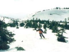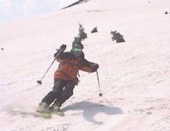 緩くなった斜面で無理矢理ステップを蹴ろうともがいている図です。 ちなみにこのスキーだと延々と緩斜面が続くと地獄をみます。(全然滑らないのです。) |