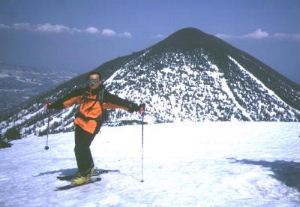 | 後ろは高田大岳。 天気もよくて気持よさそうに見えますが強風で立ってるのもやっとの状態です。 バイクツーリングと兼ねてのスキーなので使用する板はショートスキーです。 バインディングはジルブレッタ300、専用シール付きの山用スキーです。 |