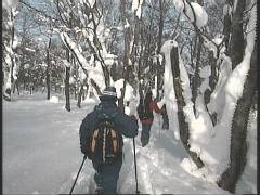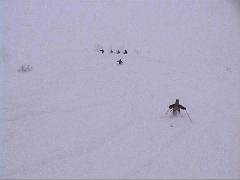 最初の急斜面です。 最大40度近く(以上?)あるのではないでしょうか? でもフカフカの雪なのでエイヤっと一気に降りれます。 これが気持ちいいんです。 |