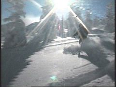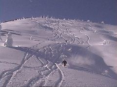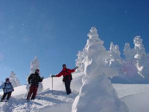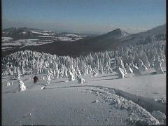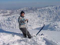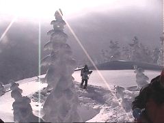 ロープウェイ山頂駅からしばらくはガスの中でしたがお目当ての斜面まで来ると突然光が射してきました。