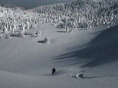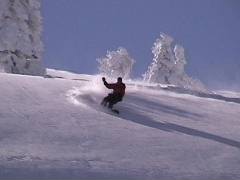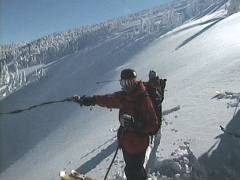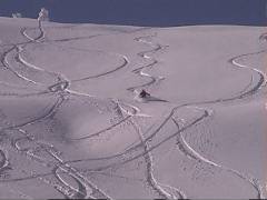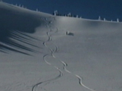 まずガイドさんが滑ります。 なかなか良さそうな斜面です。 で、2番手行かせてもらいました。 ファットスキーで気持ちよく滑りました。 |