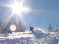 他の人たちもさぞ気持ちよくついてくるのかと思いきや後ろでバタバタ倒れているではありませんか。 実はこのファットスキーで滑ると少々クラストした斜面も何の苦労もなく滑れるのです。 曲がろうとしなければ問題ないはずですが・・・ |