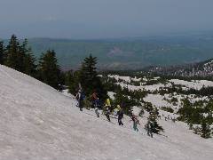 でも参加者は意外にたくさん。 天気も上々。 少しゆっくり加減で上って行きます。 ちなみに私は1・2日は普通の板、3日はショートスキーで参加でした。 登りはいいんだけれど・・・ |