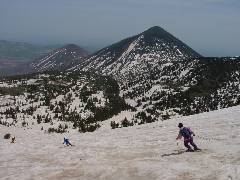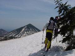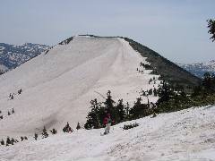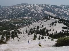 鞍部に向かって滑って行きます。 ところで今回は雪面が荒れていてショートスキーではギャップの吸収がまったく出来ずに非常に疲れました。 去年は意外によかったのに・・・ |